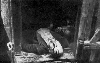 Selv på vei ut av den brennende hovedstaden tok bolsjevikene seg tid til noen lystmord. Typisk for kommunister. Her er liket av en